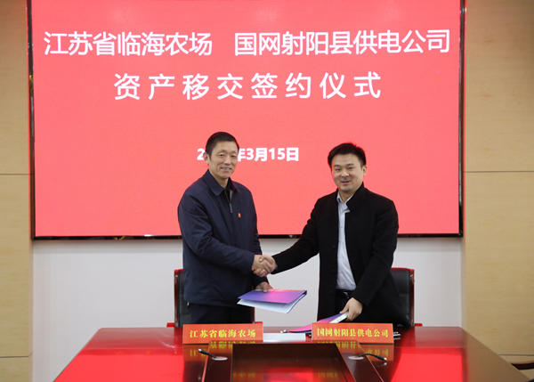 3月15日,江蘇省臨海農(nóng)場與國網(wǎng)江蘇省電力有限公司射陽縣供電分公司在農(nóng)場綜合樓七樓會議室舉行電力資產(chǎn)移交簽約儀式,農(nóng)場黨委書記、場長賀在銳,射陽縣供電分公司總經(jīng)理王愛軍在資產(chǎn)移交協(xié)議上簽字,標(biāo)志著農(nóng)場分離辦社會職能改革進(jìn)入實(shí)質(zhì)性階段。