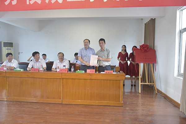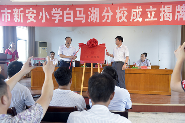 張大冬和白馬湖學(xué)校總校長(zhǎng)工楊國東代表合作雙方簽定聯(lián)合辦學(xué)協(xié)議,姚春華、咸勇為淮安市新安小學(xué)白馬湖分校揭牌。