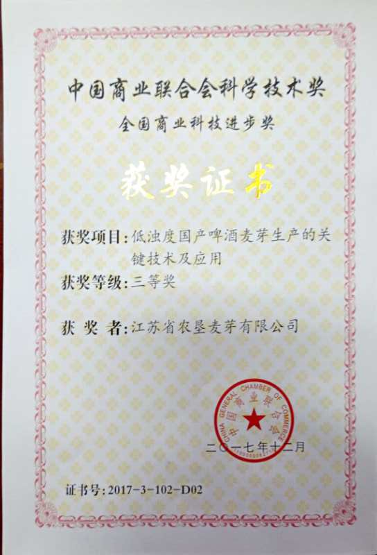 大會(huì)同時(shí)發(fā)布了2016年和2017年中國商業(yè)聯(lián)合會(huì)科學(xué)技術(shù)獎(jiǎng)、服務(wù)業(yè)科技創(chuàng)新評(píng)獎(jiǎng)結(jié)果,以及2017年全國商業(yè)質(zhì)量獎(jiǎng)、零售企業(yè)服務(wù)質(zhì)量獎(jiǎng)五星級(jí)單位。蘇墾麥芽公司《低濁度國產(chǎn)啤酒麥芽生產(chǎn)的關(guān)鍵技術(shù)及應(yīng)用》獲得全國商業(yè)科技進(jìn)步獎(jiǎng)三等獎(jiǎng)。