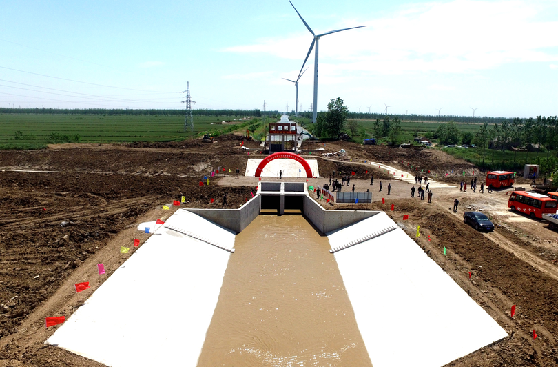 黃海軍寨渠地龍位于軍寨渠和東直河的交界處,是軍寨渠穿東直河的過水建筑物,服務下游9個生產區(qū),約10.3萬畝耕地。原軍寨渠地龍興建于1973年,設計流量10立方米/秒。新地龍為雙孔,孔口尺寸3×3.5米,過流能力達23.5立方米/秒,能夠徹底解決6月中下旬2支渠、3支渠和4支渠沿線農田用水難的問題,農田灌溉保證率達90%以上。