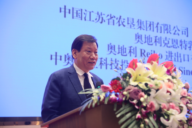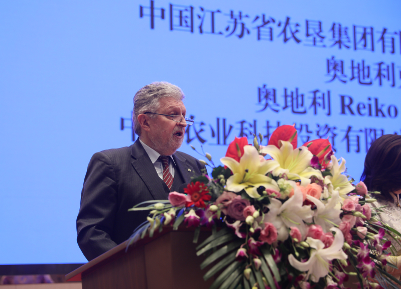 陳存根在講話中對合作框架協議的簽署表示熱烈的祝賀。他深情回憶了30多年前在奧地利學習生活的經歷以及后來在西北農大、楊凌農業高新區工作的情景。他表示,能夠見證中奧兩國在乳業合作上取得進展,十分高興,也圓了自己的一個夢想。他認為,中國是人口大國,吃飯問題永遠是頭等大事,中華民族5000年文明史就是一部農耕文明史。改革開放以來,中國最大的成就是從“吃不飽”到“吃得飽”再向“吃得好”轉變。“吃得好”有兩層意義,一是食品安全和質量上要綠色、有機、健康,二是食物結構要調整。今天雙方合作框架協議的簽署對改善食品結構、提升食品質量、讓中國人吃得更好具有長遠和現實意義。他表示,奧地利畜牧業高度發達,技術和產品質量一流,而江蘇農墾擁有政治優勢、資本優勢、資源優勢和市場優勢,合作前景廣闊。期待框架協議早日開花結果、落地生根,為中奧兩國食品產業交流和友誼作出更大的貢獻。