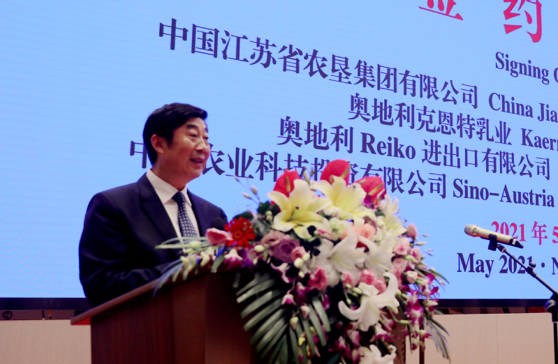 彼特勒對在江蘇和南京期間中方所給予的各種支持和幫助表示由衷的感謝,并介紹了中奧乳業國際合作項目的目標和理念。他說,中國各級政府和部門在“十四五規劃”中都特別重視農業問題,特別關注環保承受力和高品質的乳制品生產,既要長期應對滿足一個城市,一個區域,乃至一個國家人口對奶制品的供給側平衡,又要符合國際競爭中蓬勃發展的出口經濟的國際標準。江蘇農墾是一家卓越領先的大型國有公司,在開發新農業技術應用和管理系統方面擁有豐富的經驗,而奧地利克恩特乳業的新鮮原奶是被評為世界上品質最好的原料奶,生產約400個不同的產品。50年前的今天,中華人民共和國與奧地利共和國正式建立外交關系。他認為,國之交在于民相親,秉承相互尊重理解和支持的合作精神,今天的簽約儀式一定會為中奧建交50周年史上增添濃墨重彩的一筆。