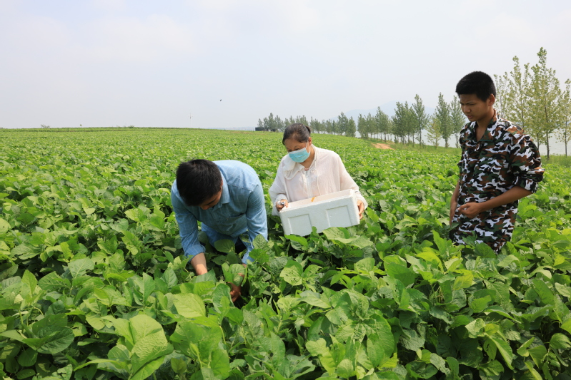 7月2日,在贛榆區塔山鎮店子村豆丹養殖基地,崗埠農場公司富民科技園技術人員正在一絲不茍地教當地村民投放豆丹蟲卵,大家不顧高溫,小心翼翼地用粘著豆丹蟲卵的牛皮紙,包裹好嫩綠的黃豆葉,然后用訂書機訂好。