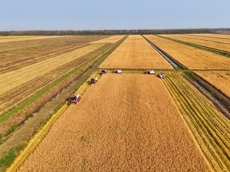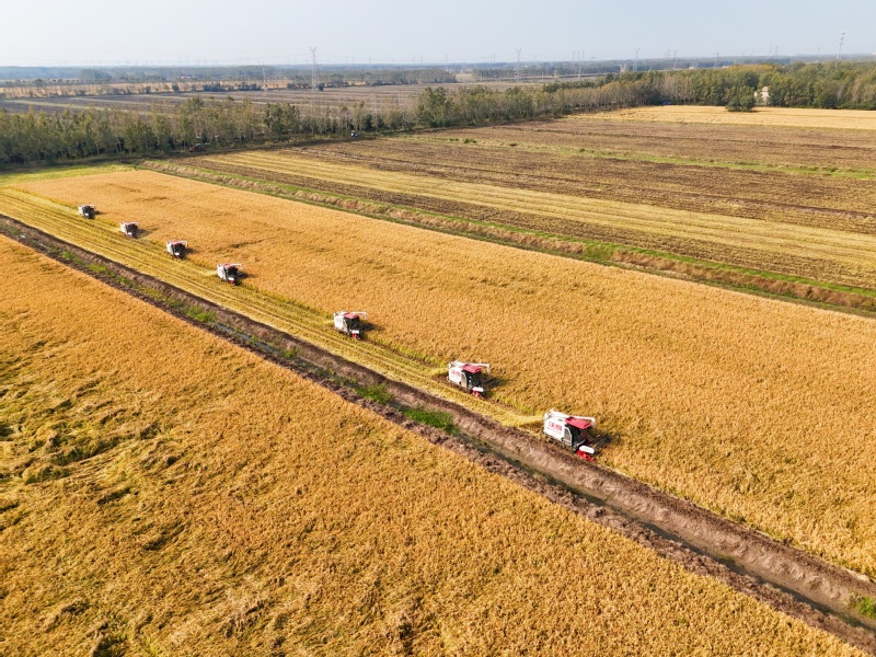 10月28日,江蘇省連云港市海州區的江蘇農墾崗埠農場,7臺收割機在農田里進行雜交水稻收割作業。連日來,崗埠農場5萬畝優質水稻陸續進入成熟收獲期,當地搶抓晴好有利天氣,積極組織農機、人員進行水稻收獲、晾曬及烘干工作,確保優質水稻顆粒歸倉。